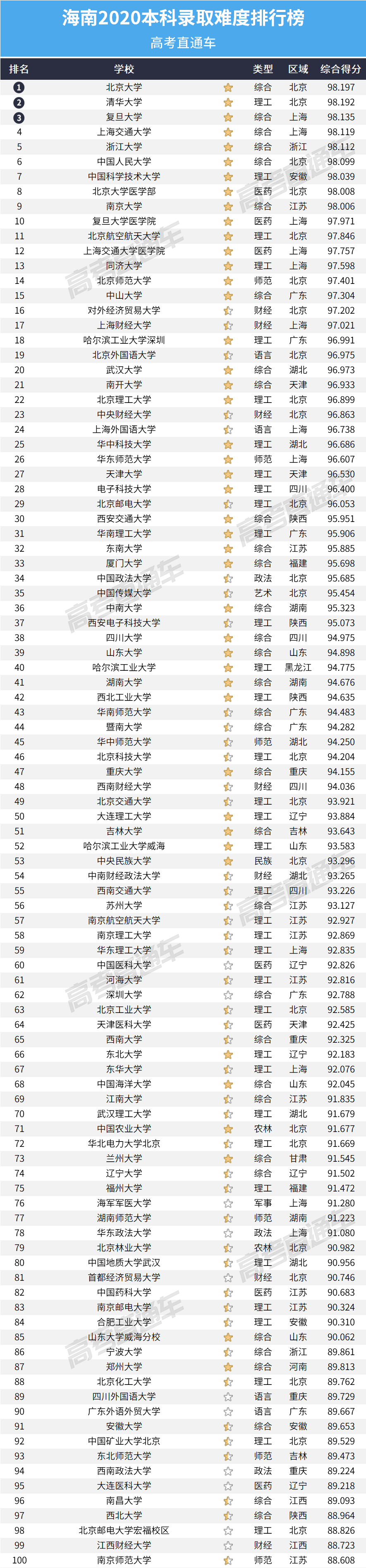 该榜单基于本省2016-2019年录取数据,预测2020年各院校录取难度,供2020年志愿填报参考。采用近四年分数线、近四年录取趋势、预测2020分数线等因子,由多种人工智能算法集成预测排名得分。得分代表预测院校2020年在本省的报考难度,得分越高,则报考难度越大。
